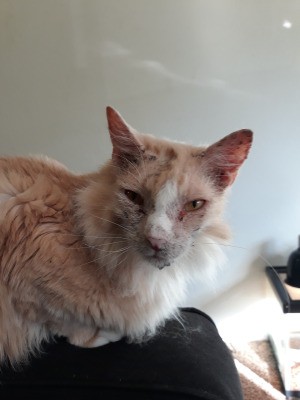 Well, went to the specialist. Feels it is a food allergy and has an immune disorder that caused it to get infected and spread. He is getting better. Hair is starting to grow back and he is back to being a social cat instead of hiding all the time.