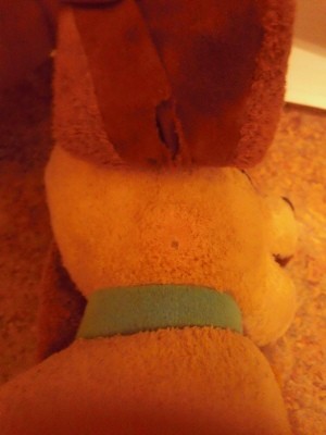 This is basically what I'm dealing with. Just the undercoating popping up where it use to be hidden and the small tear in the ear and the cheek. Along with the missing string. The way the string was designed was it was attached to one end and looped through a small hole in between the inside of the ear and then attached to the other side. I have a twin like her and the design is exactly the same and that's where I got the tag information. Her original one was exactly the same but got washed away over the years. Not sure if there is anything you can go off of for the tag.