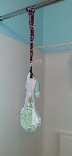 I love your idea. I needed something to make it easy to take my shower accessories to the gym. Showers there have no space for bottles of shampoo, etc. I searched for a shower caddy and couldn't find any that worked well. I finally found a lanyard configuration that will hang from the faucet or a soap dish and works well. The one I saw retail was @$20. So I did what I always do and looked around to see what I had on hand.