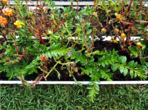 The above picture appears elsewhere on TF. I used it here to illustrate what lush vegetation can be grown in rain gutters that have a depth and width of a mere 4 inches. Many different plants can be grown in these border gutters, it's just a matter of knowing which plants have a small or shallow root system. In this case, purslane can make rather large plants while maintaining a small root system.