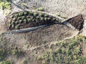 Well, the picture I've submitted here is a 'before picture'. I went back to the field and dug up more dianthus. I am finding enough to completely fill in the whale shape, including the tail. I wanted you to see the before picture because if all goes well, by mid summer I hope to submit an after picture showing (I hope), a pink whale made of tree roots and Dianthus Freynii.