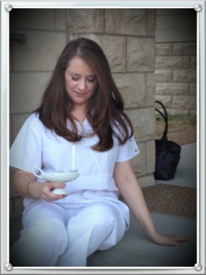 My daughter Angela will place the bracelet on the wrist of her daughter when she graduates college, then pass it down to my other granddaughters at the time of their graduation to wear in memory of their grandmother. My daughter Angela will keep the bracelet as a family heirloom. The bracelet is on her wrist she is holding her nurse's oil lamp.