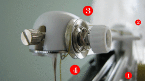 4 The Needle Guide- Pass the thread sideways from the tensioner through the metal guide.
