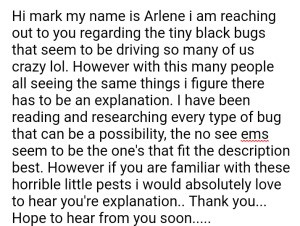 There's something connecting people with this,because there's no answer as to what,even if they are bugs at all.Like aliens,jk,but I've researched everything,no answers.
