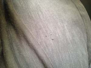 I highly doubt it's because of wearing them or the material being too thin. Because I just bought a shirt and it was hanging in my closet and I just went to put it on and now it has a bunch of tiny little holes in it and it's right at the breast area. This is never been worn before so it's some kind of bugs that I can't figure out. I don't ever see any moths and I have othy balls and cedar closet. I'm not exactly sure what to do