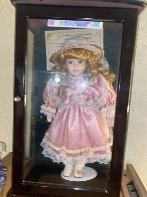 I found a similar to your doll Ashley Belle Porcelain Doll "Carol" w/COA + Glass & Wood Display Case www.ebay.com/