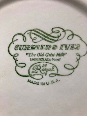 "The Royal China Company was founded in 1934 during the Great Depression for the purpose of making inexpensive, decorated dishes that were sold in dime stores and given away as premiums at movie theaters, gas stations and in grocery stores. Royal's most popular pattern was Blue Willow until 1949, when the company introduced a charming new line of blue and white dinnerware based on the nostalgic prints of Currier and Ives. In all, there were 27 different images in the Currier and Ives pattern.