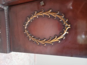 Thank you. There are no numbers or makers name. I attached more photos to determine age. I am guessing around 1930's as my Grandmother was born in 1902. The back is in poor condition, thin wood. Do you know the approximate name of the style of the piece? ie., Louis IV, etc, I have no idea, thank you.