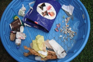 The reason I carry a large DOT trash bag is because many times, I pick up large items like feed sacks. beer cartons or pizza boxes that have blown out of a vehicle on the way to the dump. Mostly though, I pick up small items such as plastic bags, paper, plastic bottles, aluminum cans, and lots of cigarette butts. I took a photo to show you. (I use this pool for yard work only)