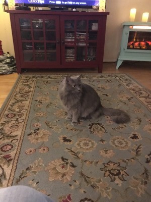 He has green eyes and a solid grey almost silver coat, that is long and thick. His paws are big and he has a huge fluffy tail. Sorry, trying to list some details hoping it may help.