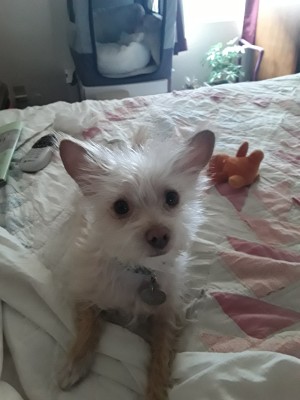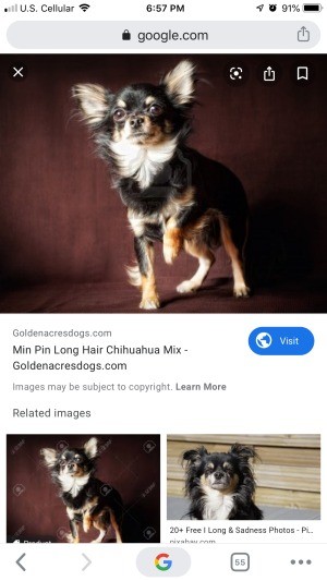 Long haired 'pom chi' Pomeranian chihuahua. I'll add a pic of cocoa!!! I have had my baby for 8 or @ year looks identical minus the long hair around ear and such. I did see her mom and dad so I k ow mine is a pomchi and he looking identical to your cutie! Promise problem solved!!! Enjoy you baby very loyal , jealous and protective breed!