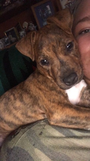 I see a little lab, maybe a drop of boxer and a tad of hound!  Heinz 57 mix of cuteness!!!  With you an amazing life together!
