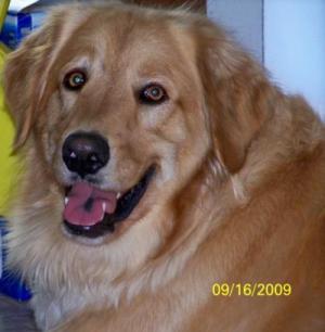 Sure looks like a Chow mix to me. I would guess Golden Retriever for the mix but it is hard to tell from that photo. The snout and ears look a lot like my Chow, Honey. And she has an entirely purple tongue.