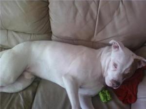 She also has very different markings then most pits, being mostly white with light brown brindle spots, and light brown golden eyes. She is extremely short haired and has no hair on her belly (not because of a skin condition). She is currently 45 lbs. and 10-11 months old. I think she might have some kind of pointer in her but I would love to hear others opinions. Thank you for your input.