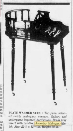 One 1928 reference calls "American Colonial" furniture "not of mahogany ancestry". In 1939 Florida news article, the writer was promoting the virtues of "a table boasting English ancestry in Mahogany".