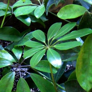 I don't think it's a Schefflera. As with same, each stem terminates in a 'rosette' of 7-11+ leaves. At first glance, I thought it was a eucalyptus. Now, I clearly see, it is not. Good luck with this one.