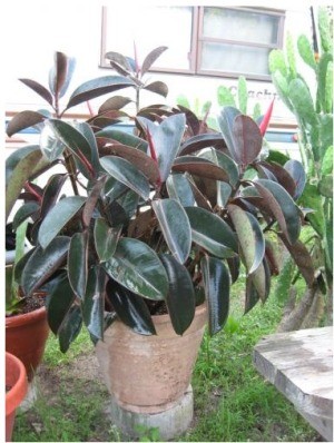 The first one (the darker one) looks like a rubber tree plant, from what I could see. I'm attaching a pic of a rubber tree plant to show you what they look like.