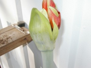 Yes, yes, yes. That's what I get for reading my mail late (not first up to bat, that's all!)! Amaryllis. Not difficult to grow, at least whenever I've seen/had any. I'm in California, but that shouldn't make any difference. Usually has two large blooms on opposite sides of one long stem.
