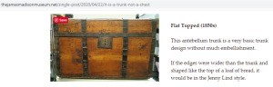 Your trunk has a very basic design without much embellishment. I found a trunk that is very similar but appears to be smaller. It has exactly the same paper and the original ribbon to pull the lid forward as your trunk: www.thejamesmadisonmuseum.net/