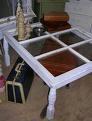 Here is a photo of a coffee table I made out of a window. I left the panes in, put in some old items, then bought a piece of plastic for the top. I bought some legs at a Menard's store.