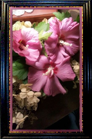 I picked the hibiscus blossoms and made an arrangement with dried oak leaf hydrangea blossoms.