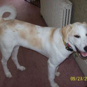 What Breed Is My Dog? (Yellow Lab/Basenji Mix?)Can anyone help me identify my dog's breed? He is 7 months old and 60 lbs, has a very curly tail. He does not bark much, but when he does it is very deep and loud. He loves children. I adopted him through a rescue group and their take on his breeding may or may not be true.