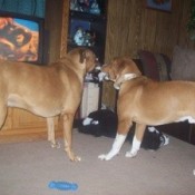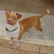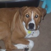 What Breed is My Dog?Can anyone help me determine what type of dog I have? He's the brown and white dog in the picture. When I adopted him I was told he was pit bull, rottweiler, and terrier. He has a curly Q for a tail, weighs about 60 lbs and is only 8 months old.