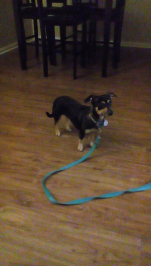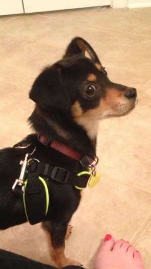 I am pretty sure my baby, Cora, is a min pin chihuahua mix with some terrier as well. She weighs 15 pounds and wears small harnesses and shirts. She's got a mix of long and short hair and all the attitude of both breeds. She's very loving and loyal, but also very stubborn.