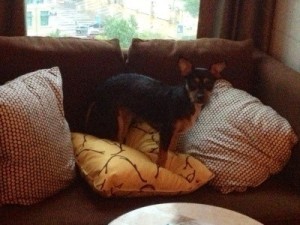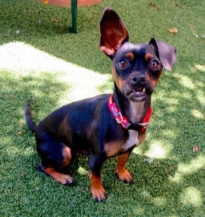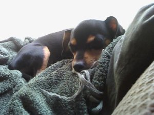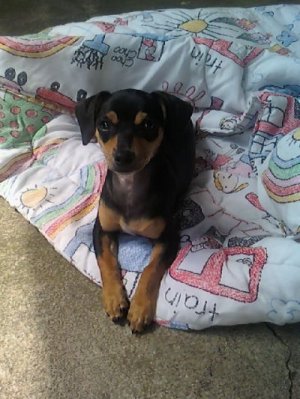 Hi, meet Cookie! He's my 1.5 year old Chi-minpin and weighs about 4 kgs, appr. 8 pounds. He can be a stubborn pain in the @ss, but I love him to bits and can't imagine not having him in the house. During daytime he's a real fierce minpin and when the evening falls he becomes a cuddly Chihuahua.
