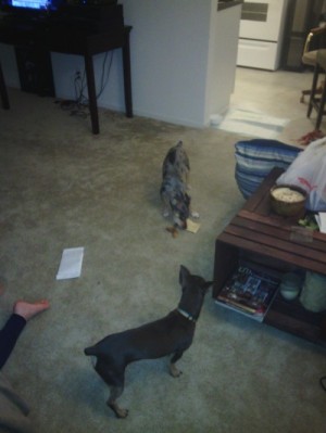 I have a shelter litter of minchi puppies. They're 8 weeks old and mostly house trained to dog litter boxes. They may be the cutest litter I've ever fostered for the shelter.