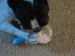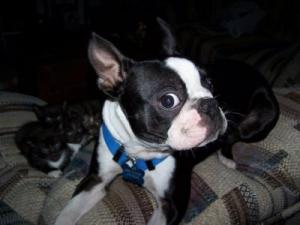 Oreo is our 1 year old Boston Terrier. We got him the end of May 2007, I had just signed up to our local Freecycle group site and within 3 days he was posted. We had been talking about getting a Boston Terrier after we got married in June. BUT there he was and we brought him home and he is a big part of our family. We drove 125 miles round trip to get him.