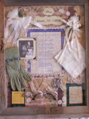 My friend Gwen gave me some things of her mother's who had passed away. She asked me to make a picture using these keepsakes for her to save in remembrance of her. I used turn clips nailed to the frame and foam board for the back so she could take the back off and remove items anytime. I put old yellowed newspaper down before placing others items on top. There was a pin that spelled "Mother", a mustard seed necklace she always wore, a card explaing the meaning of a mustard seed for good luck, a mothers poem, her eye glasses, a favorite bracelet, her church gloves, a black and white copy of a picture of her working in her kitchen peeling potatoes, a hankie, a corsage, a rose she saved, and a poem someone had written about her when she passed.