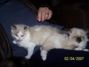 Puffy and Squirt 6 month old mixed breed kittens. Born under my bed. They like to chase each other through the house. This looks like a 2 headed cat, but no, just Puffy and Squirt. They are so sweet but can be devils too.