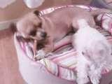 She always chew stuffed toys, she loves to sleep (otherwise, she seems lazy when she sleeps. When I pick her up she starts to growl.) She's always jumping at the door and wants to go outside. She loves to eat. She always hiding from us and has gotten us to worry. She is always quiet, and never barks.