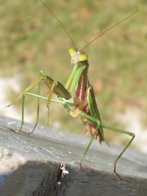 I took a video of a mantis a few days ago on our front porch. He followed me as I video taped him from many angles and then suddenly, he jumped onto the camera then onto me! What a funny video that turned out to be! Got some excellent 'still' shots of him also. [See below] I love these insects and am just amazed by God's creation! I even watched two or three 'hatchings' and got them on video last year. Hundreds of miniature mantis babies falling out of the nest! INCREDIBLE! I wish we had more of them! They are SO COOL.