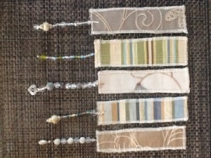 Stitched Book Marks can be made of scrap easily. Just cut the length and width you need. Make a small beaded tail with a dangle at the end or ribbon. Then, with either the same fabric or a coordinated fabric, stitch the two back to back design side out leaving a space to insert the ribbon and stitch it up.