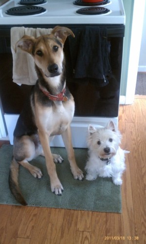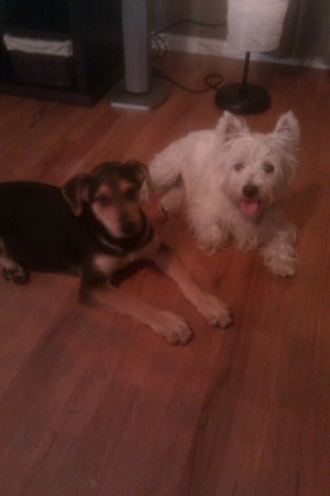 This is Charlie (Doberman Shepherd Mix) and Lucky (Westie). Charlie is 1 year old and 80 pounds. Very good dog besides some minimal digging and chewing. He loves fetch and chasing Lucky around. He is 10 months in this photo.