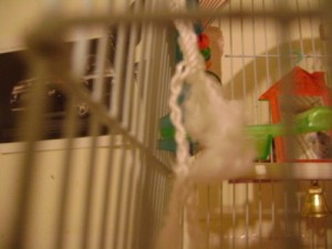 I noticed it looks like the toys at Drsfostersmith and I decided to tie a strand in his cage and start to unravel it a little, pulling the parts of it apart and let him play with it. He really does play with it all the time, as a matter of fact, he tries to stick it through the cage and give it to Phoenix, who is our rooster, to play with too. Of course Phoenix does not really care to play with it.