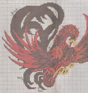 Hi Sandy J, Found the book with the Gamecock pattern faster than I thought I would. It is from a 1973 book I purchased. This pattern did not have a specified color chart. Back then, you guessed at the colors when the chart was printed in color. Anyway, I have written the colors on the parts of the bird.