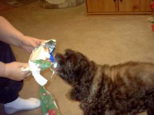 here is "mama's little Alexx" opening christmas presents......she actually was going around ripping paper off presents if we didn't watch her she seems to know what christmas is about and loves getting gifts under the tree