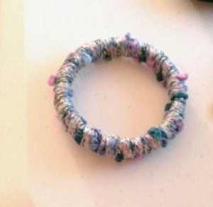 These bangles are made with recycled cardboard tape rolls. They are all made into bracelets that you can wear on your arm. They are very inexpensive and fun to make!