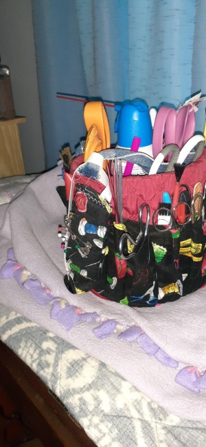 Make a hole in the lid, thread the yarn through it, put the yarn in the container, put the lid on, and your yarn will stay clean and neat while you use it. It won't roll around on the floor, either. If you are using more than one color of yarn, make enough holes in top of the lid for each color.