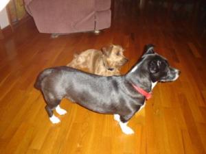 Amazing dogs! :o) When she and my 4 yr. old dog get to playing, Pebbles (ACD/Blk. Lab) will try to herd her into a corner and nips at her feet as if she were a cow!
