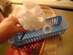 Put your floral organizer in your pot and arrange your flowers. To cover your organizer I painted coffee filters with red food coloring to put in the pot around the flowers. The last step is to glue bees around your pot.