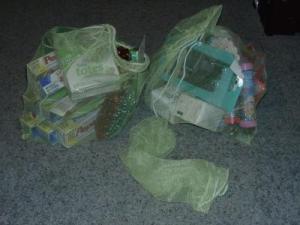 I know it's almost fashionable to use cloth bags for grocery shopping - but in Europe they buy much smaller quantities of groceries, usually shopping daily - and here we make weekly runs - How do I know how many cloth bags to try to bring? I do collect and re-use small plastic bags for all sorts of things. I just packed up my vitamins in one - and we use them for trash and other purposes - and even as flying toilets in an emergency on the boat - and we recycle the rest of them - And as our trash molders out in a large open trash container (for the whole apartment) for a week, putting it in plastic is the only sensible thing to do to keep down flies and so on.