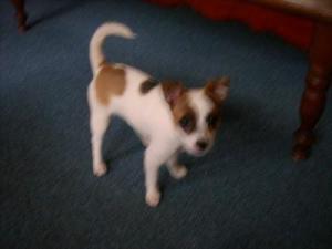 Naughty Spottie is a 4 and a half year old Jack Russel Terrier. I took part of my rent money, drove to Rugby and picked her up at the Cenex, second guessing myself all the way there. She likes to catch flies in mid air, bark at the cats outside, play with my son (he chases her, then she chases him dragging with whatever she can find; clothes, blanket, etc) oh, and dig holes in the yard whenever she can sneak one in.