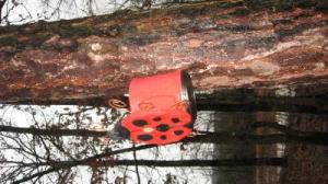 Here's my ladybug birdhouse. The only mistake I made was putting the hole too high. I will fix it, make it about two inches from the bottom of the can so the babies can hop out easily. I like to be able to pop open the bottom and use that for clean out.