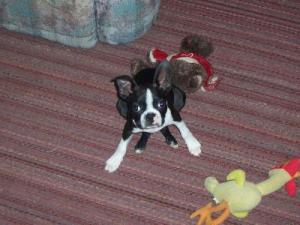 Bella has had two beautiful sets of puppies. They were about four weeks old. They are Boston Terriers too. Their main enjoyment is eating, sleeping, playing, and of course the usual, pottying all over the place.