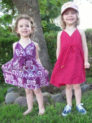 This is a photo of my 2 granddaughters wearing their new "dresses." The girl on the left is almost 3 years old and the girl on the right is age 4. They both wear size 4 clothes. Their dresses are actually ladies shirts, size small, that I got brand new off the clearance rack in WalMart for $1 each! I didn't have to do any sewing for them to fit. They tie around the neck like a halter top and the waist has a string to gather it in (I actually gathered it tighter after the photo and it fit better). This style of shirt is a perfect dress for little girls!
