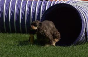 I got a little cocker girl from a breeder and there were no claims about size. She grew to all of 19 pounds, 10 pounds less than my other one. But she is an athlete and wonderful girl. Here she comes out of the agility tunnel! Nothing mini in this girl's attitude!